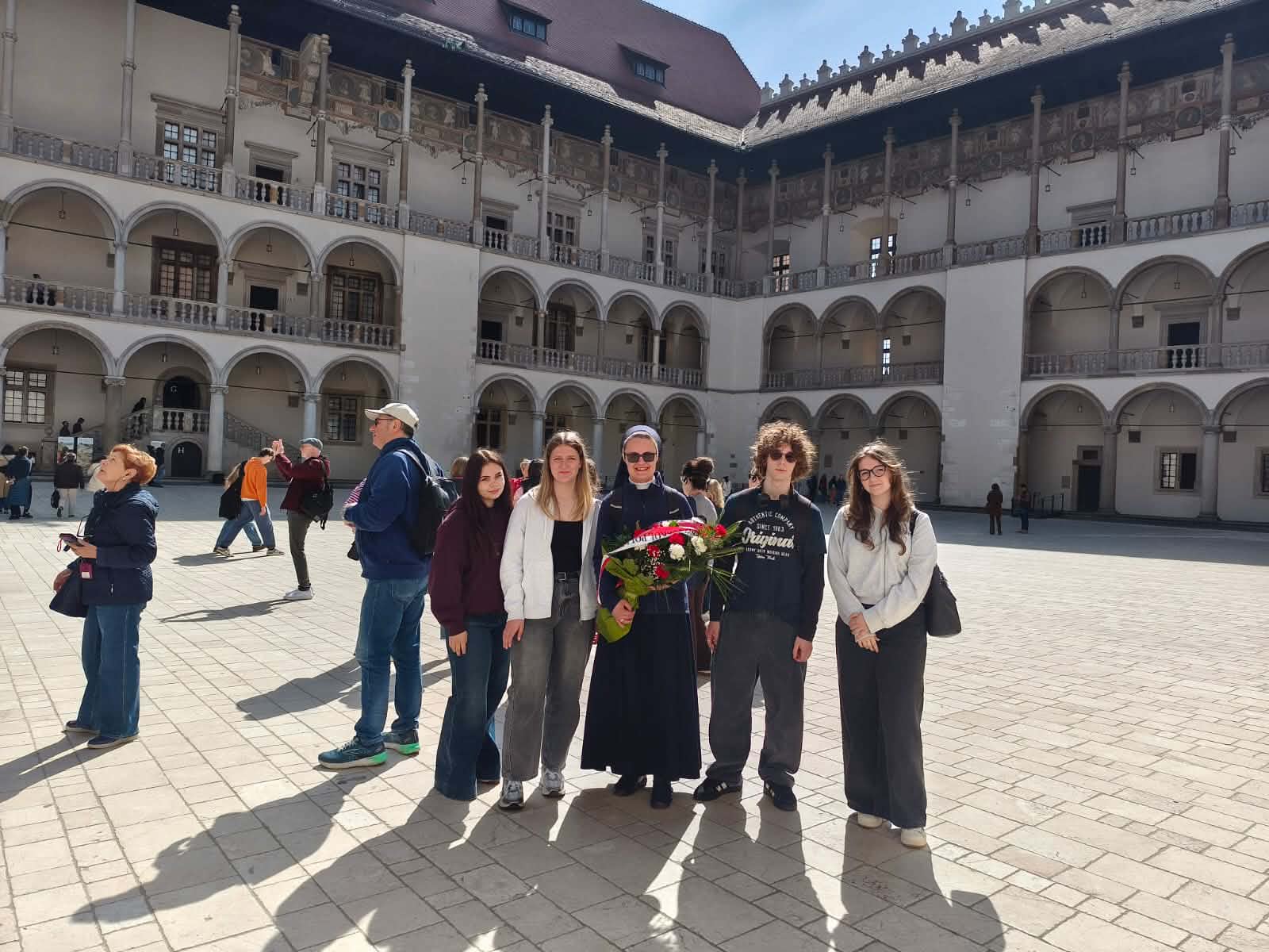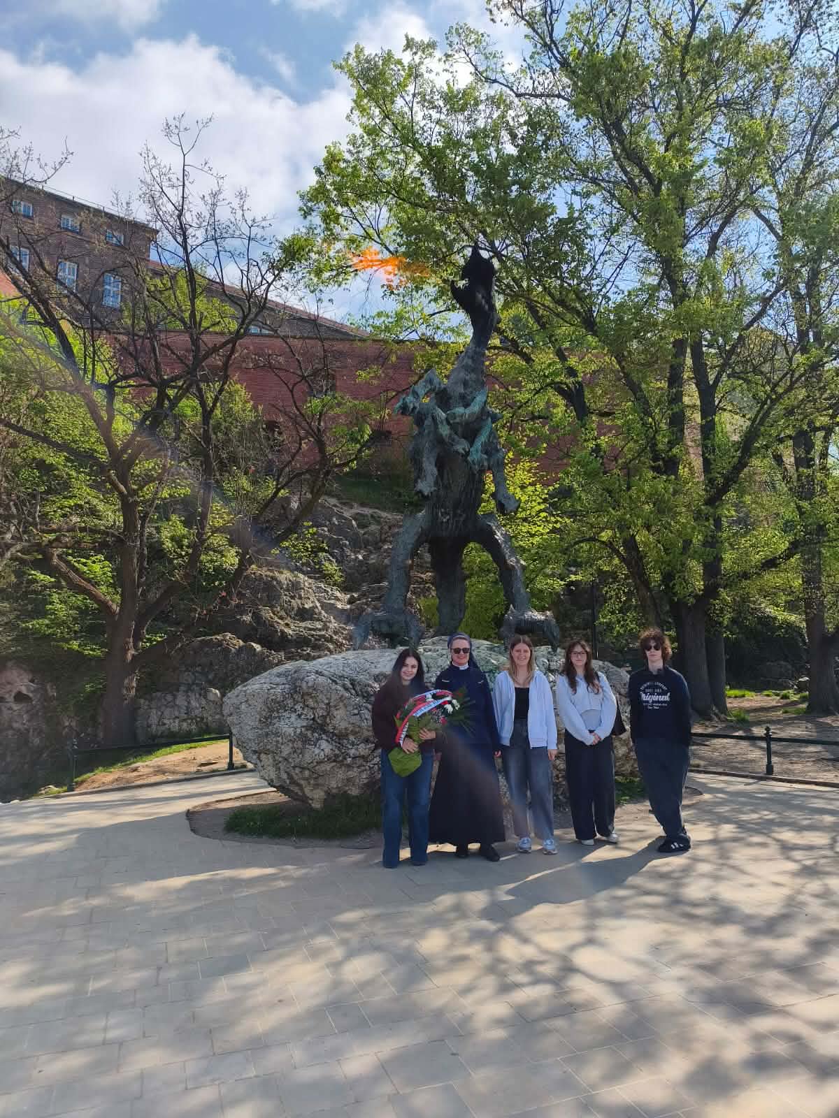 Z racji przypadającego w tym roku 100-lecia szkoły, złożyliśmy okolicznościową biało-czerwoną wiązankę. Będąc w królewskim grodzie, zachwyciliśmy się również odrestaurowanym i lśniącym ołtarzem Wita Stwosza w Kościele Mariackim. Udało nam odpocząć i zobaczyć namiastkę pięknego Krakowa. Zapewne jeszcze tam wrócimy.