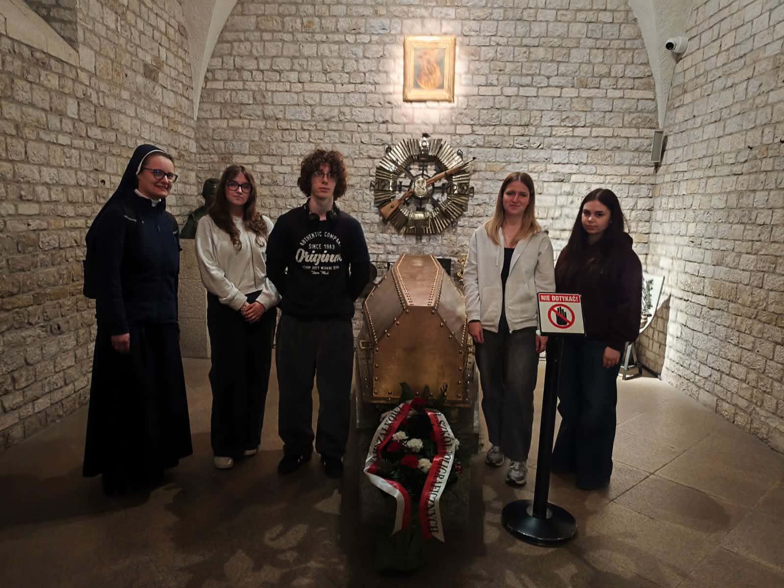 W dniach 24 i 25 kwietnia czwórka uczniów naszej szkoły wraz z siostrą Moniką udała się do Krakowa. Swoje zwiedzanie rozpoczęliśmy w sobotę od przypomnienia legendy o Smoku Wawelskim i Szewczyku Skubie. Następnie zwiedziliśmy Archikatedrę Wawelską wraz z kryptami oraz historycznym Dzwonem Zygmunt. Najważniejszym momentem była wizyta przy grobie naszego Patrona - Marszałka Józefa Piłsudskiego.