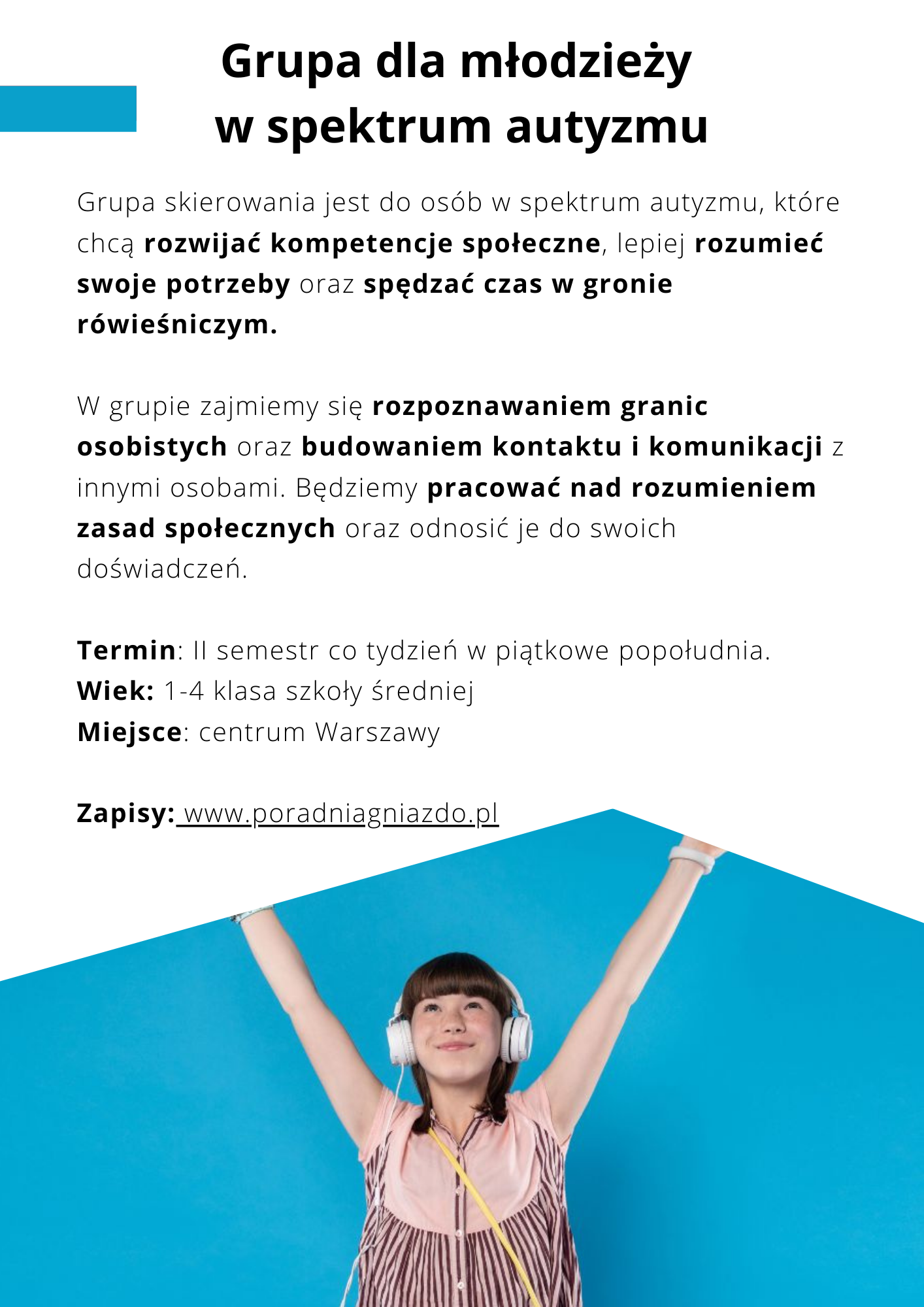 Grupa skierowania jest do osób w spektrum autyzmu, które chcą rozwijać kompetencje społeczne, lepiej rozumieć swoje potrzeby oraz spędzać czas w gronie rówieśniczym.