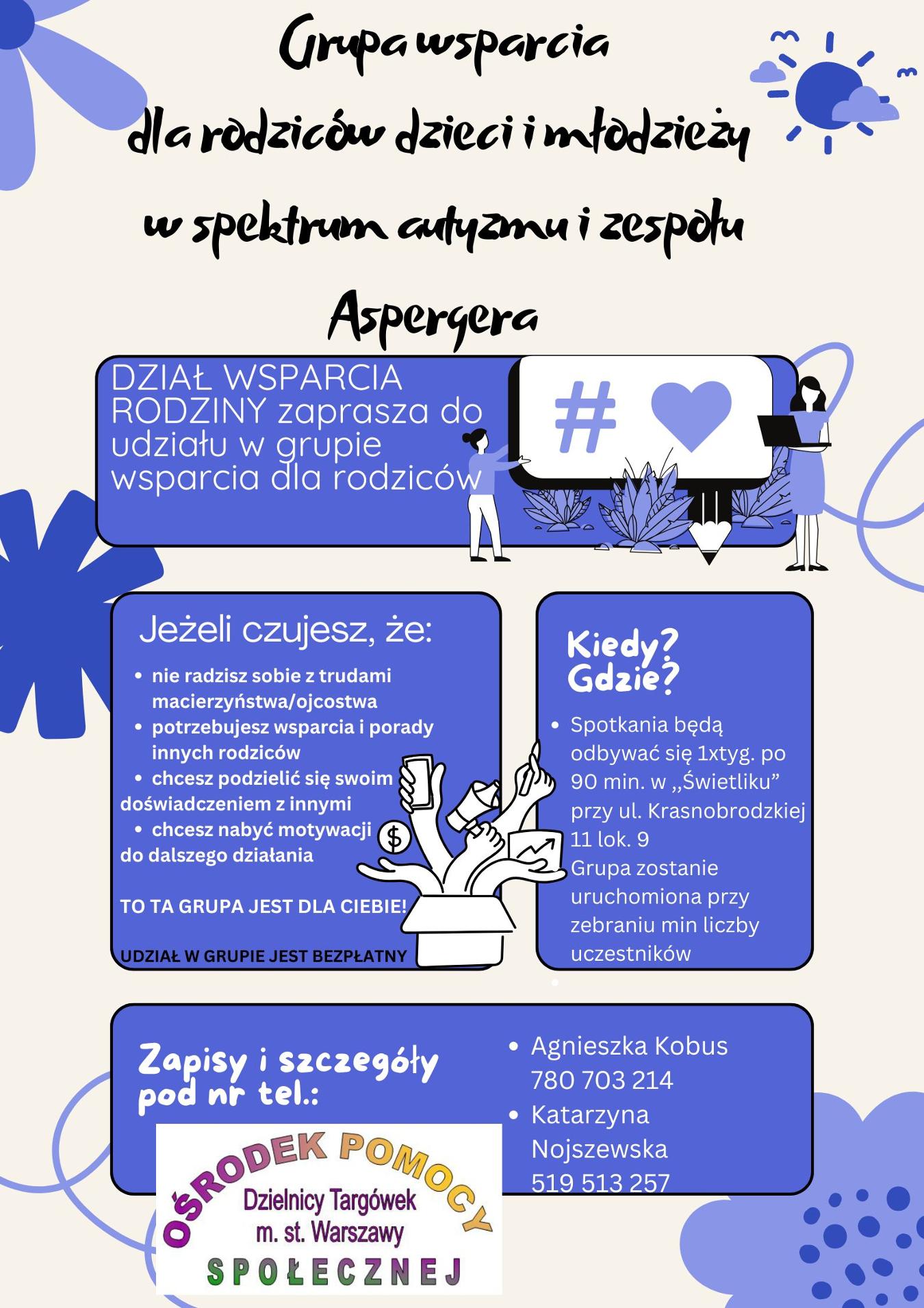 Dział Wsparcia Rodziny zaprasza rodziców dzieci i młodzieży do udziału w Grupie wsparcia dla rodziców dzieci i młodzieży w spektrum autyzmu i Zespołem Aspergera.