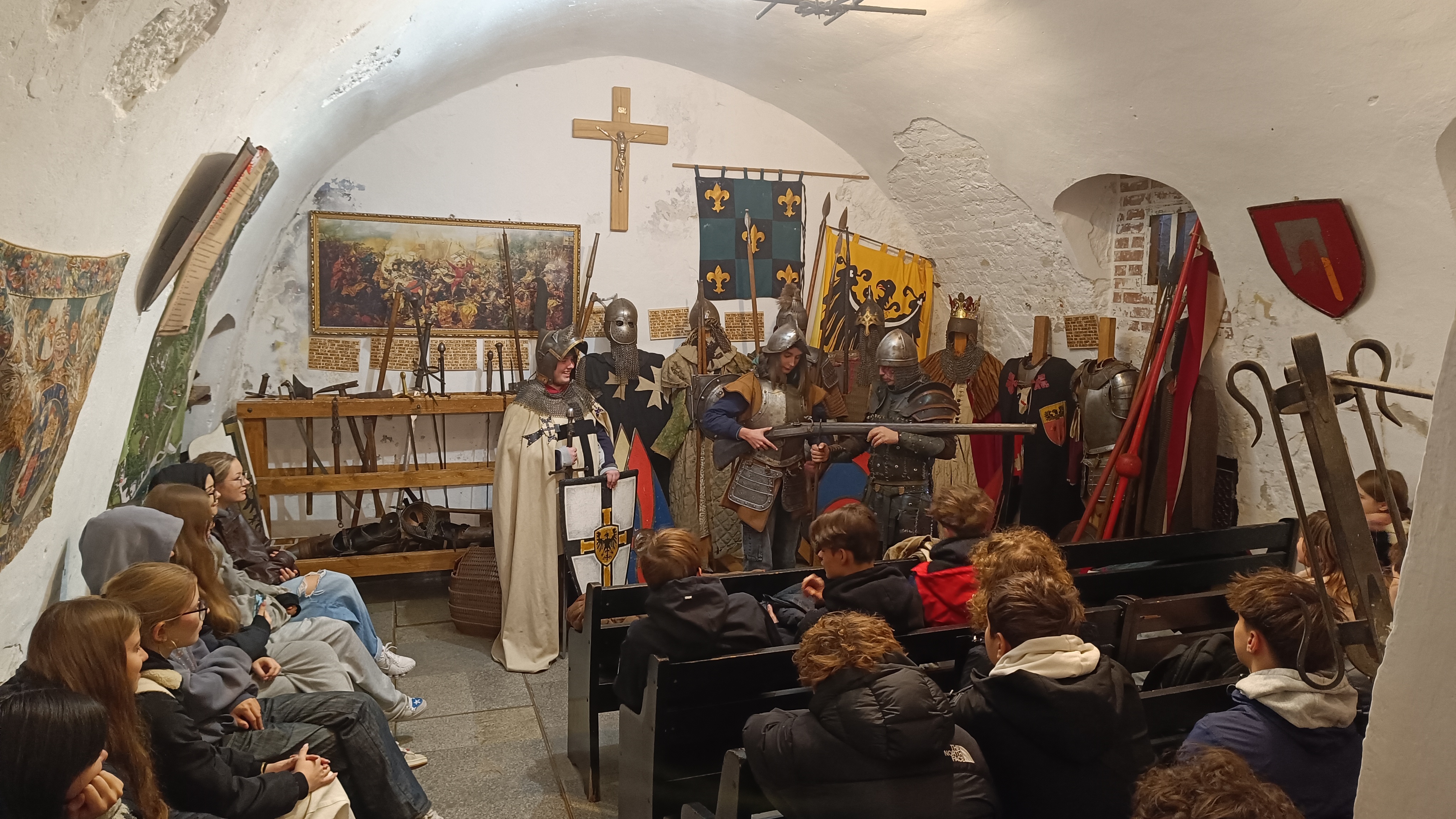 Ostatnim punktem zwiedzania Sandomierza była Zbrojownia, w której uczniowie mogli zobaczyć i przymierzyć stroje rycerskie, miecze, zbroje oraz inne historyczne eksponaty, słuchając ciekawych opowieści o historii i sztuce walki.