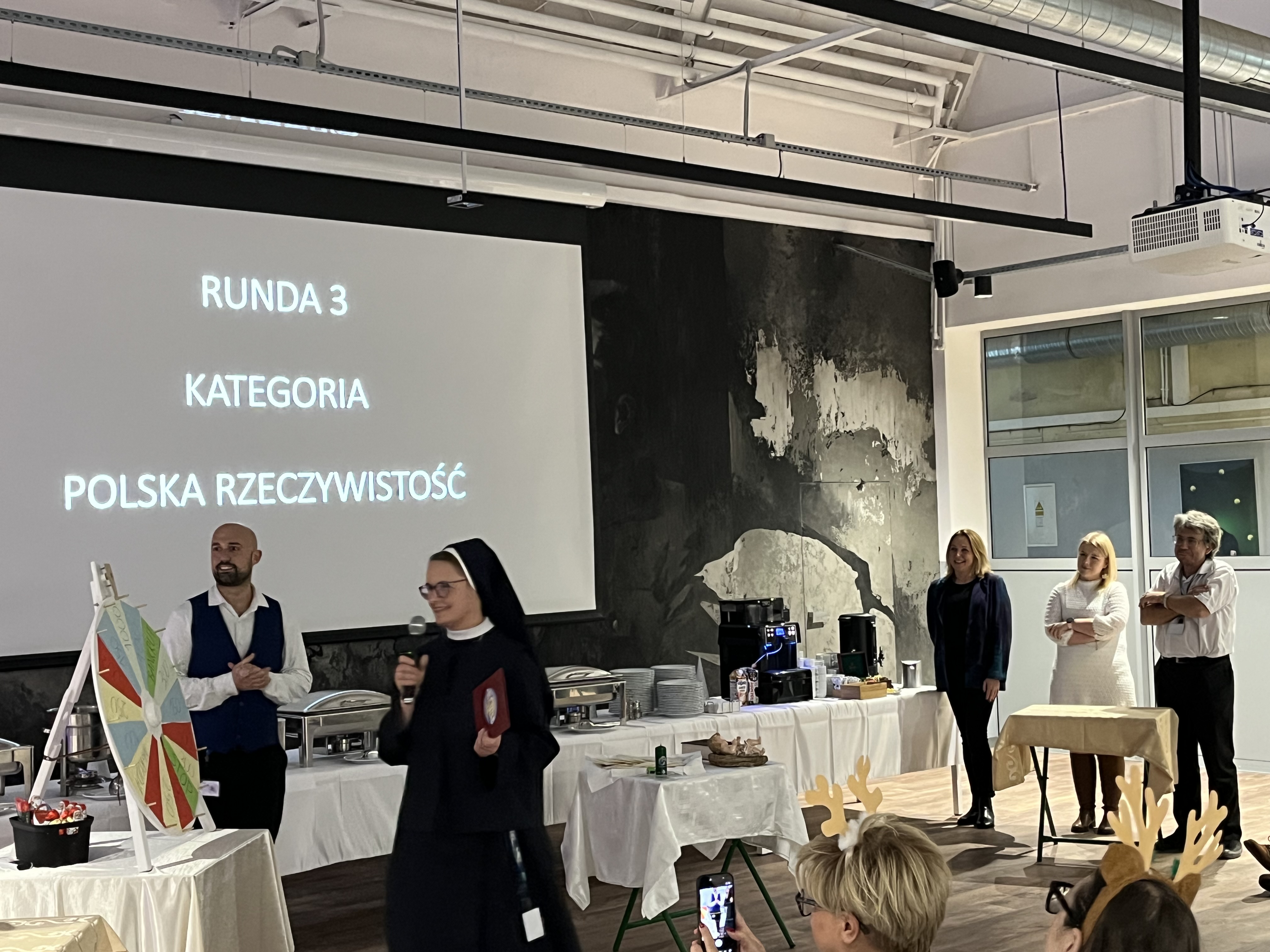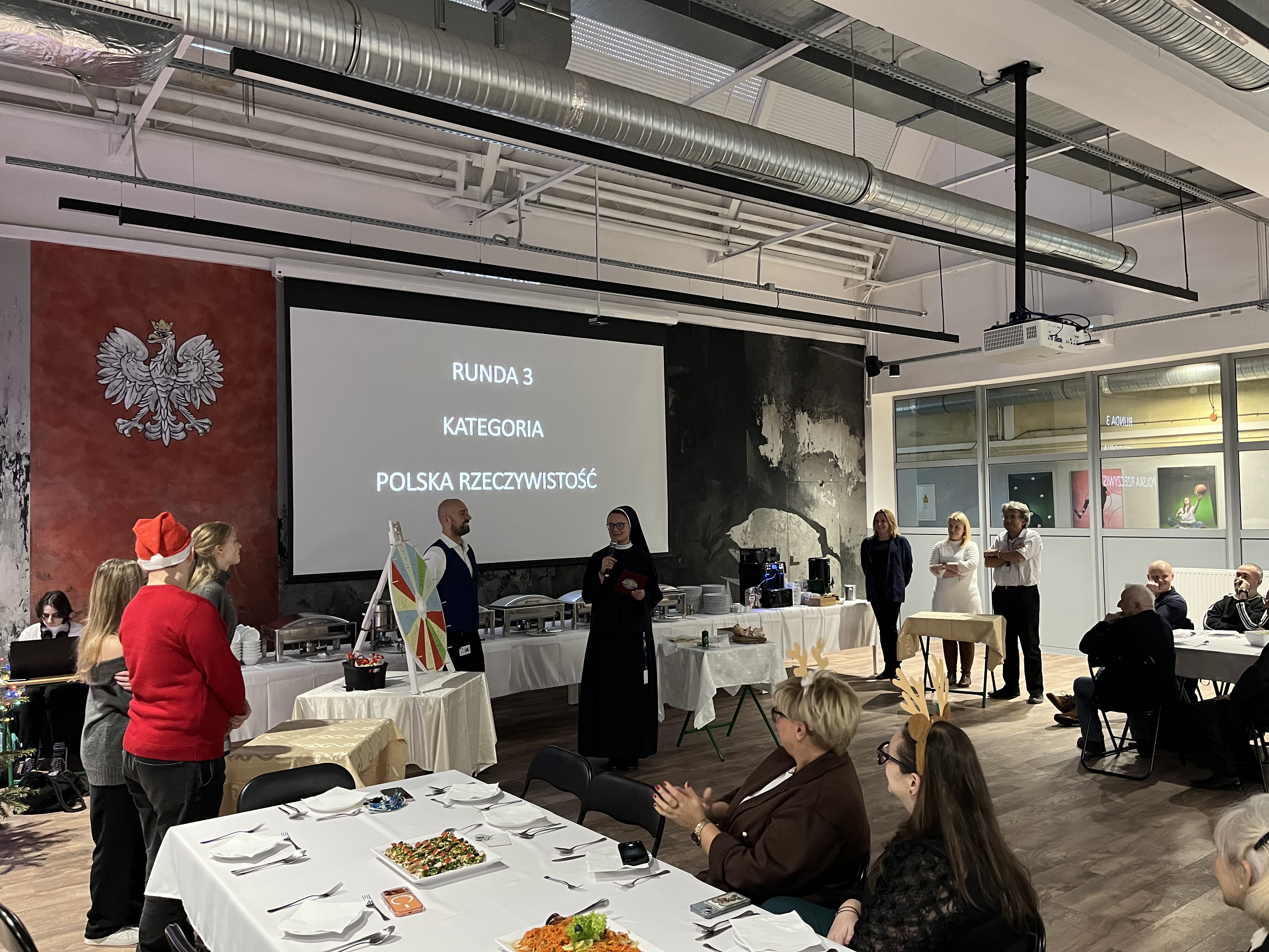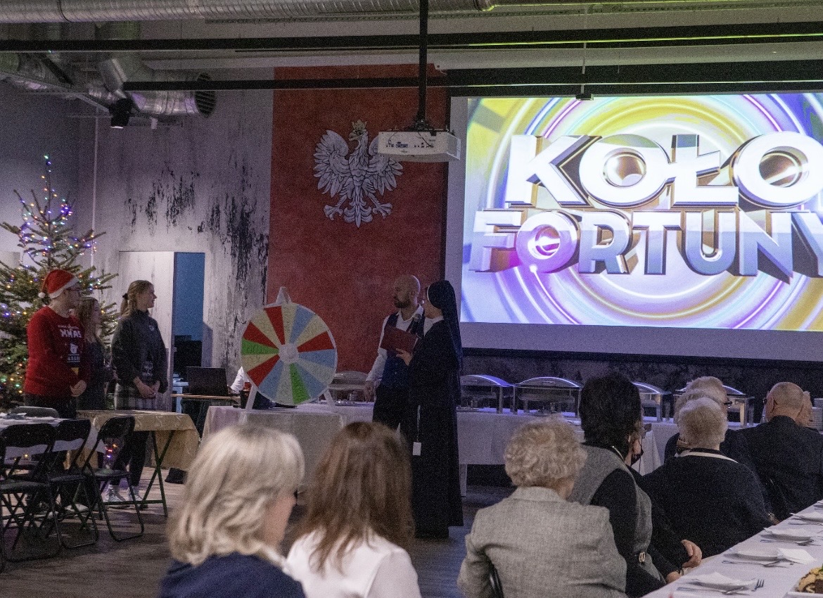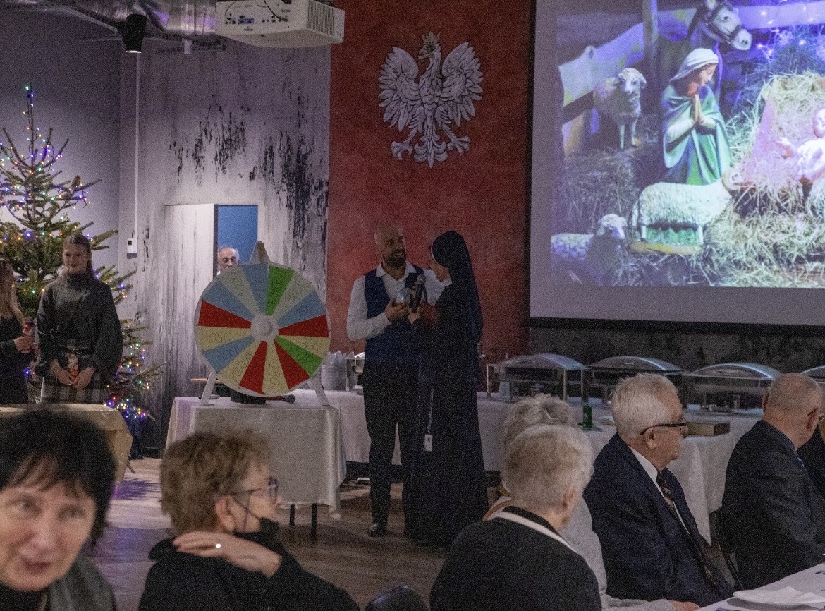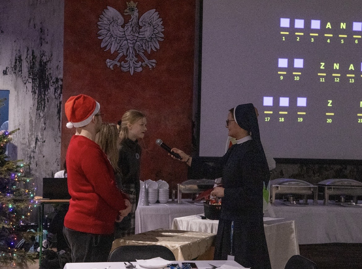 Spotkanie przebiegało w ciepłej i radosnej atmosferze. Siostra Monika zorganizowała grę dobrze znaną widzom jako Koło Fortuny, w której zmierzyli się ze sobą nauczyciele i uczniowie. Było też wspólne łamanie się opłatkiem oraz degustacja tradycyjnych potraw wigilijnych.